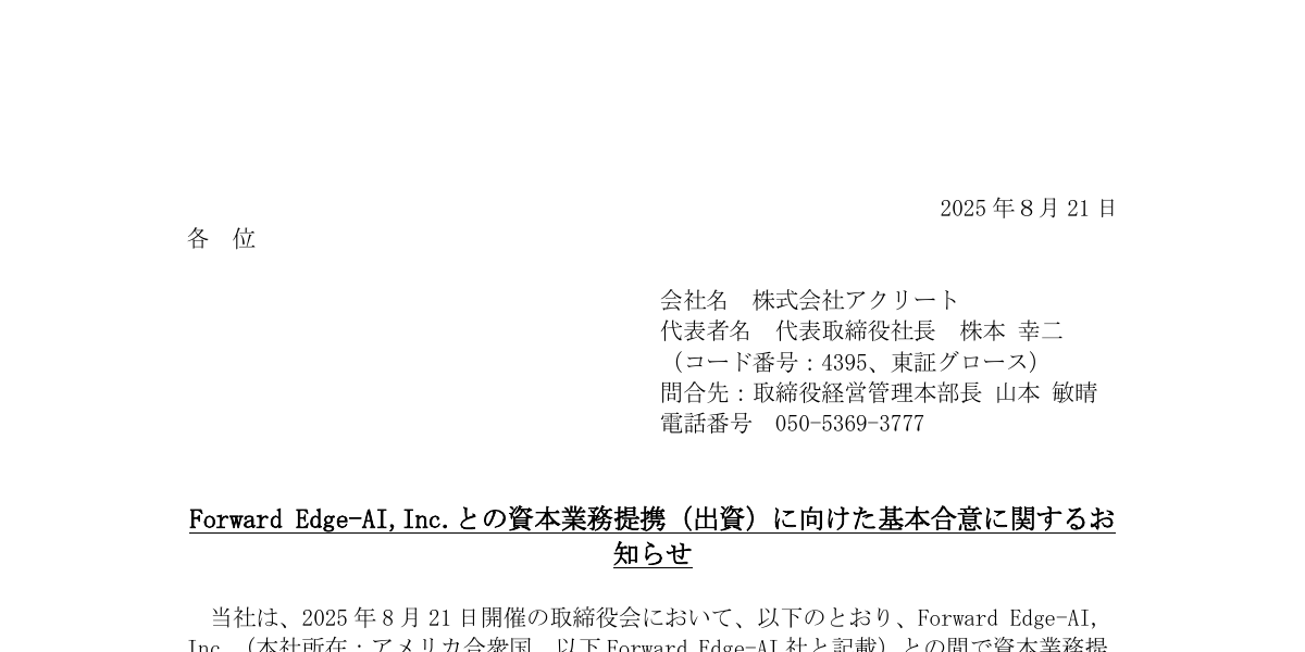 Forward Edge AI,Inc.との資本業務提携(出資)に向けた基本合意に関するお知らせ | G-アクリート(4395 - 適時開示情報【iPhone/Android】
