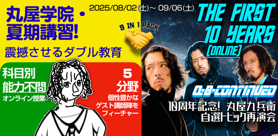 丸屋学院・夏期講習! 震撼させるダブル教育/10周年記念! 丸屋九兵衛自選トピック再演会 THE FIRST 10 YEARS【丸屋九兵衛オンライン9イベント in 1パック!】SF限定感想文コンクール/少女マンガ:花の24年組/昭和総括/黒人音楽の思想と政治と宗教/ダークサイド/映画よもやま/サマータイム・ウェストサイド/宇宙を遊ぼう