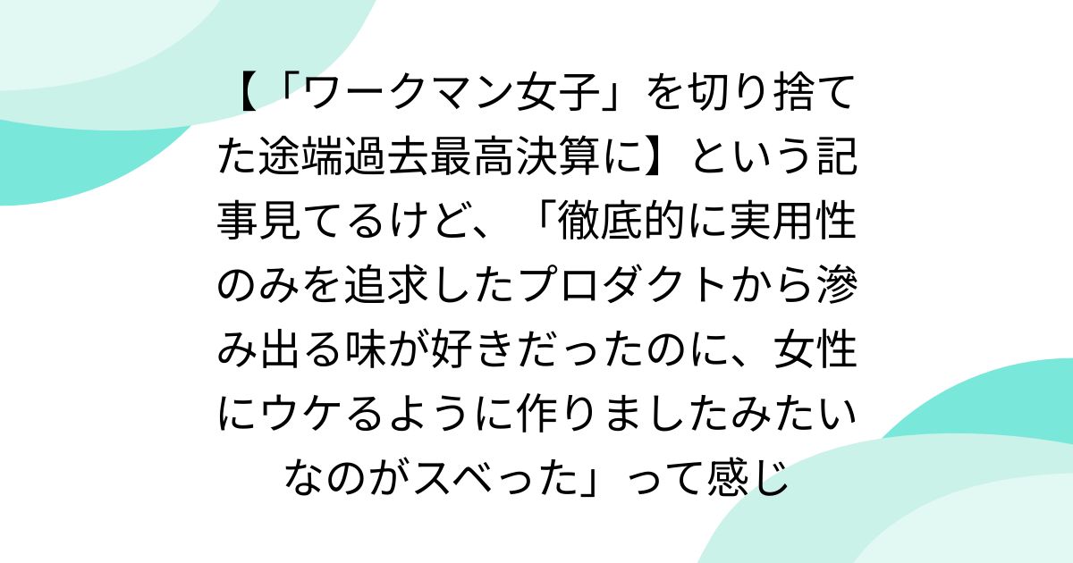 【「ワークマン女子」を切り捨てた途端過去最高決算に】という記事見てるけど、「徹底的に実用性のみを追求したプロダクトから滲み出る味が好きだったのに、女性にウケるように作りましたみたいなのがスベった」って感じ
