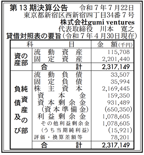 gumi ventures 決算公告(第13期) : 官報ブログ