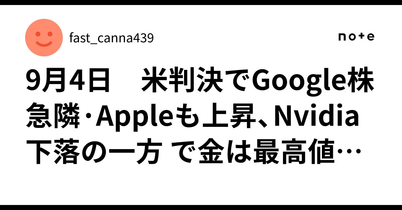 9月4日 米判決でGoogle株急隣·Appleも上昇、Nvidia下落の一方 で金は最高値更新|fast_canna439