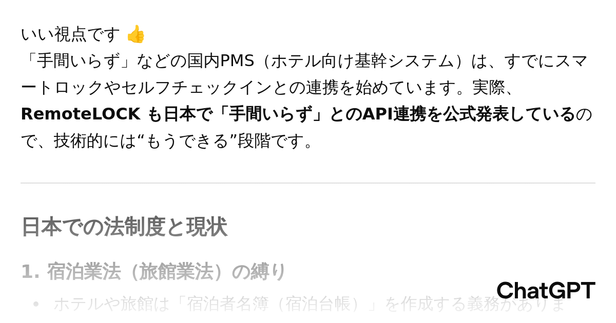 RemoteLOCKとMEWS 提携を発表 ↓ChatGPTに聞いてみた 日本は構造計画研究所さんと手間いらずさんの提携とかあり、民泊は条例解釈で進んでるけど、ホテル業の法律的には本人確認でグレーなところが残るらしい マイナンバー活用等、法改正が待たれる chatgpt.com/s/t_68c56c92c6… pic.x.com/GI8qYM7JF0 x.com/remotelock_eur…