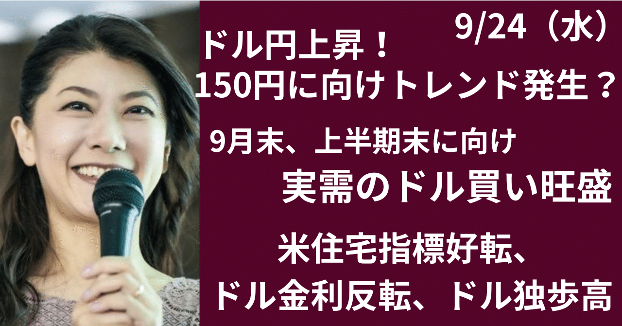 ドル円上昇、 上半期末に向けた実需のドル買いか note.com/hiroko_lounge/… ・8月の米新築住宅販売は予想外に急増 ~米株には手仕舞い売りも ・指標好転でドル金利反発、 ~ドル独歩高の展開 ドル円、150円に向けてトレンド発生?!