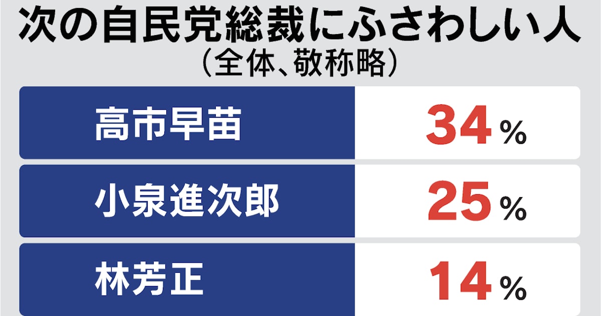 あなたはこのニュースについてどう思いますか? 関連する最近のニュースを知りたい場合は 「自民党総裁」 「高市早苗氏34%首位」 「林芳正氏14%」 で検索可能です。