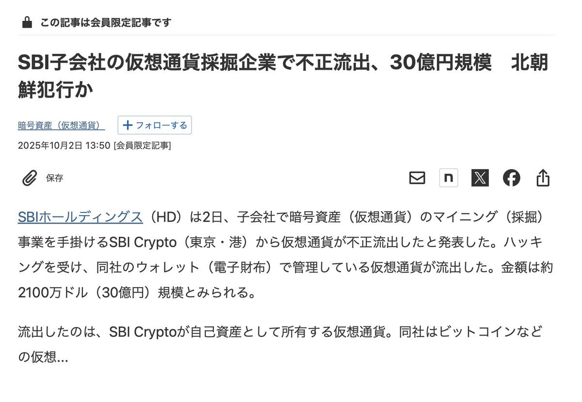 2025年10月2日 13仮想通貨採掘のSBI Cryptoで不正流出、30億円規模 北朝鮮犯行か日本経済新聞 🤔 去年はビットコイン482億円。同じとこかな? nikkei.com/article/DGXZQO…