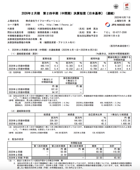 ライフコーポレーション 2026年2月期第2四半期決算 : 官報ブログ