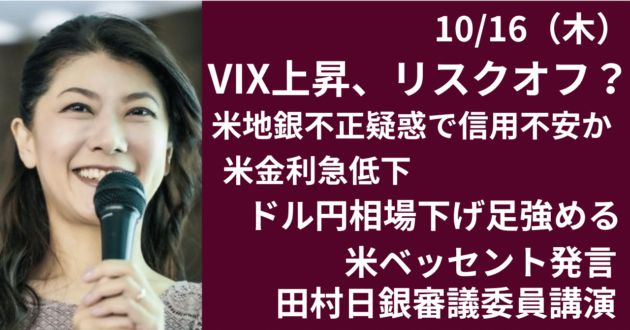 VIX上昇、リスクオフ相場へ? ドル金利低下でドル円下落 note.com/hiroko_lounge/… ・日米財務省会談、 9月の「為替共同声明」確認 ・日銀、田村審議委員 「利上げ判断すべき局面」 ・VIX上昇、米株急反落 ・米地銀2行、不正疑惑で信用懸念 pic.x.com/5FF4GVgwvW