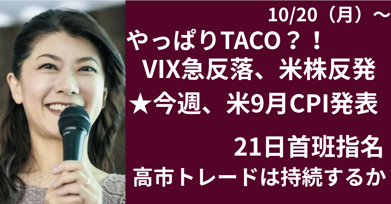 やっぱりTACO? VIX急低下、楽観戻るか note.com/hiroko_lounge/… ・VIX急低下、米株反発 ~トランプ大統領発言で買い戻し ・米長期金利、一時4%を割り込むも反発へ ・日銀の年内利上げはあるか ★24日発表の米CPIに注目 ・21日、首班指名 ~20日にも自民、維新連立に向け合意か