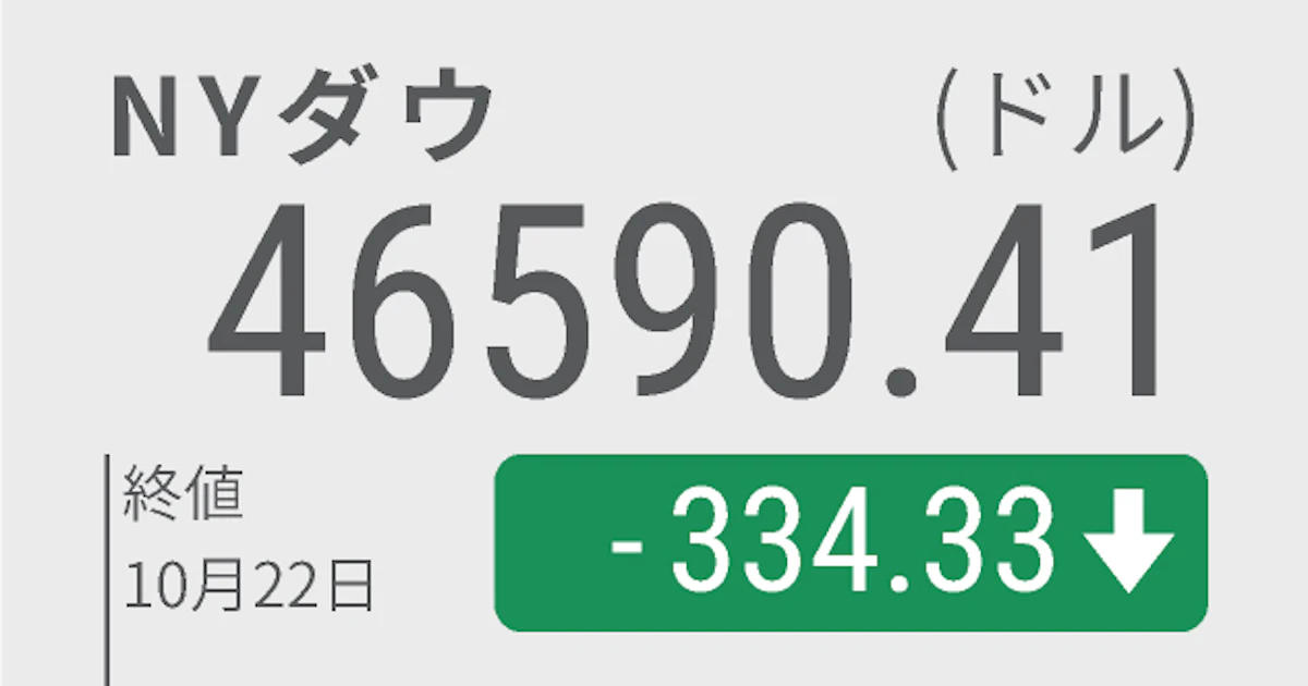 NYダウ334.33ドル安で反落。Netflix決算で10%下落、米中対立警戒も重荷に。 一方、日経平均はわずか8円安と底堅く推移。高市政権の経済対策期待が下支えに。米株との温度差が鮮明に 📊詳しい分析は日経電子版で ▶nikkei.com/article/DGXZQO…