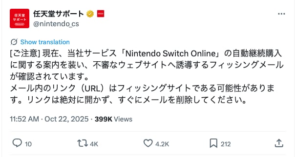 任天堂、「Nintendo Switch Online」継続購入の案内を装った詐欺メールに注意喚起