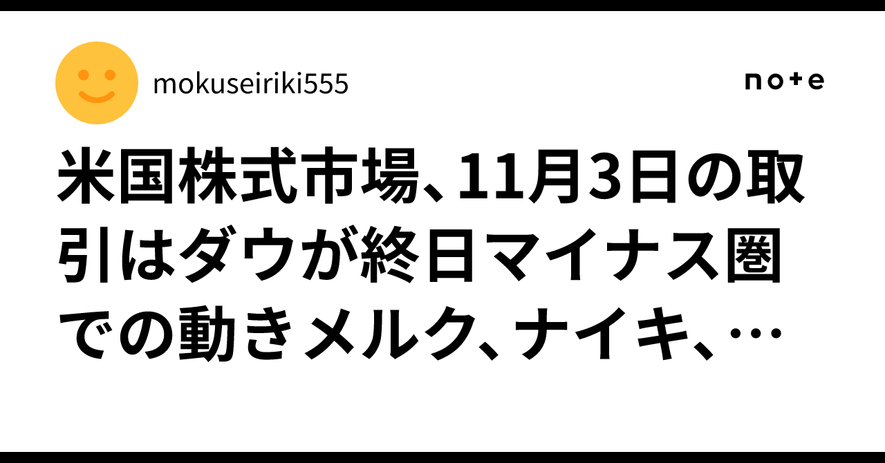 米国株式市場、11月3日の取引はダウが終日マイナス圏での動きメルク、ナイキ、3Mの下落で指数を押し下げました。一方NASDAQは終始プラス圏の動き。|mokuseiriki555