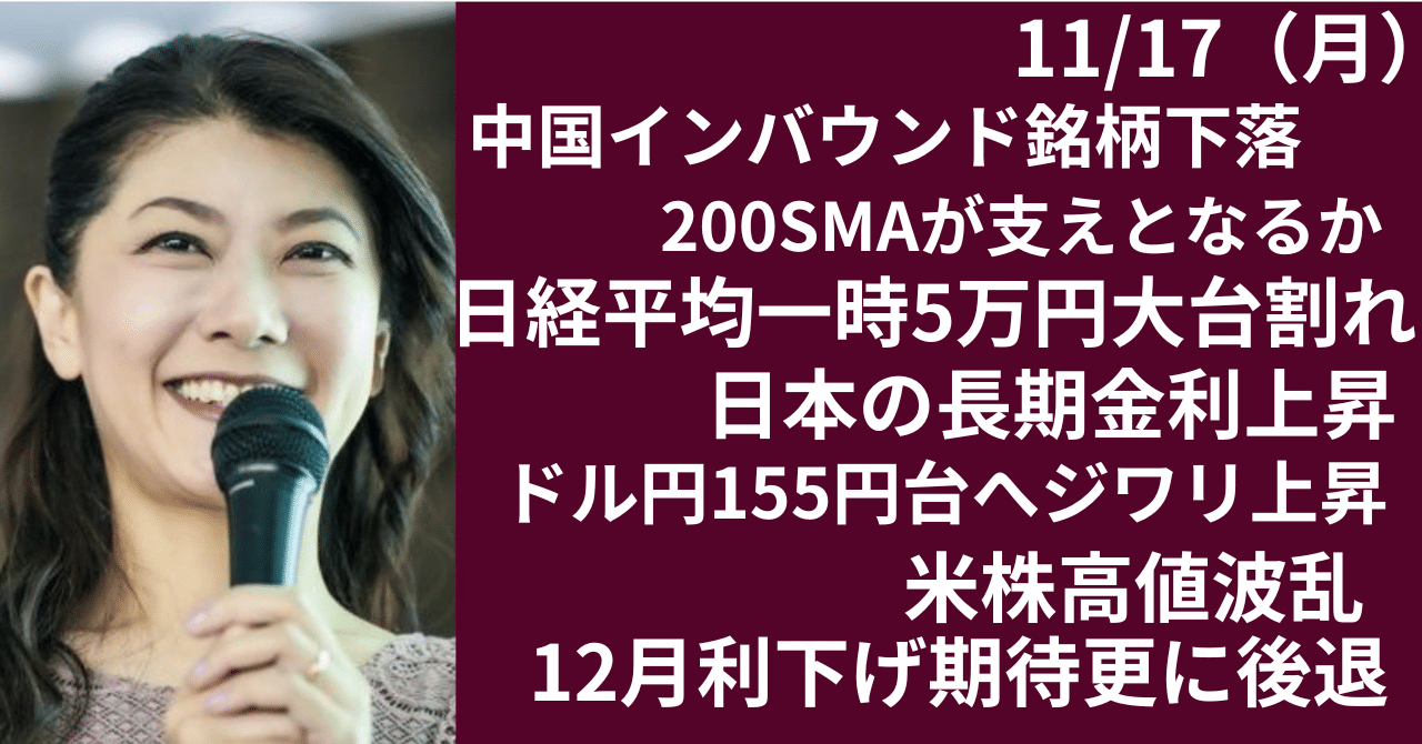 日本株中国関連銘柄下落で 日経平均一時5万円割れ note.com/hiroko_lounge/… ・米株高値波乱、12月利下げ折込み 更に後退 ・日本の長期金利上昇、 ~日本株上昇なら心配は無用か ・日本79月期GDP速報値6期ぶりマイナス ・中国関連銘柄に売り、日経平均一時5万円割れ ・中国の投資が急減速