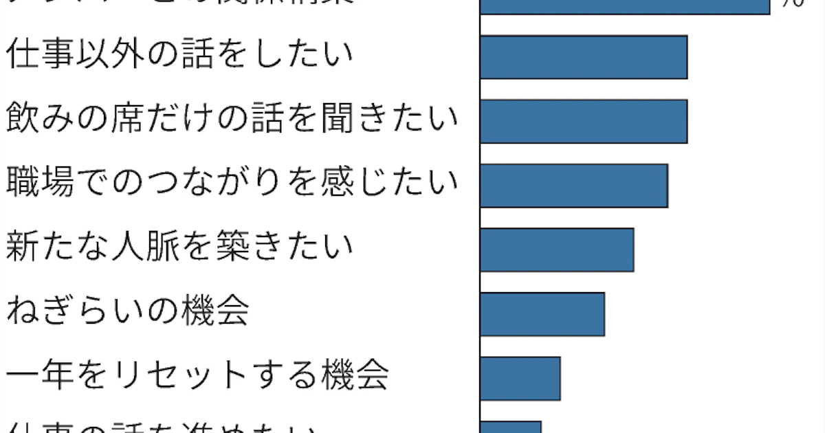 忘年会に参加したい理由「メンバーとの関係構築」が最多で47.0%だった。日本経済新聞 nikkei.com/article/DGXZQO…