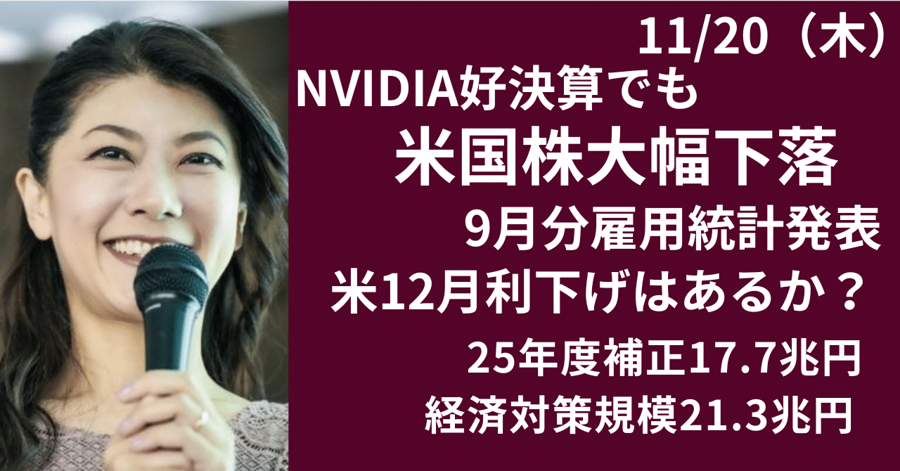 note.com/hiroko_lounge/… ・NVIDIA予想上回る最高益、 ~11月期65%増収見通し ・日本株大きく反発上昇も、 日経平均5万円大台維持ならず ・米9月雇用統計、失業率4.4%に上昇 ・日本の金利上昇、対中関係の行方 ・経済対策21.3兆円 25年度補正17.7兆円