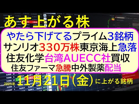あす上がる株 2025年11月21日に上がる銘柄。プライム下げ3銘柄。サンリオ330万株。東京海上急落。住友化学台湾企業買収。… rizumu.net/movie/%E5%88%9…