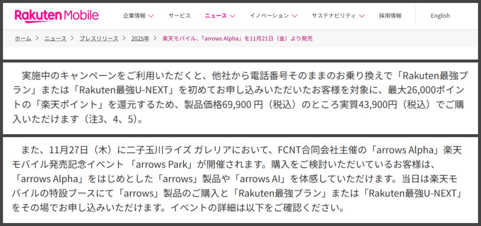 楽天モバイル、「arrows Alpha」を6万9900円で発売 二子玉川で実機体験イベントも