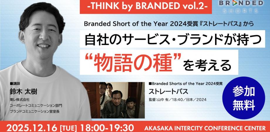 【12/16 18:00~】THINK by BRANDED vol.2|東レ ブランドコミュニケーション室 室長 鈴木太樹氏が登壇 ~Branded Shorts of the Year作品からみる物語の種を考える