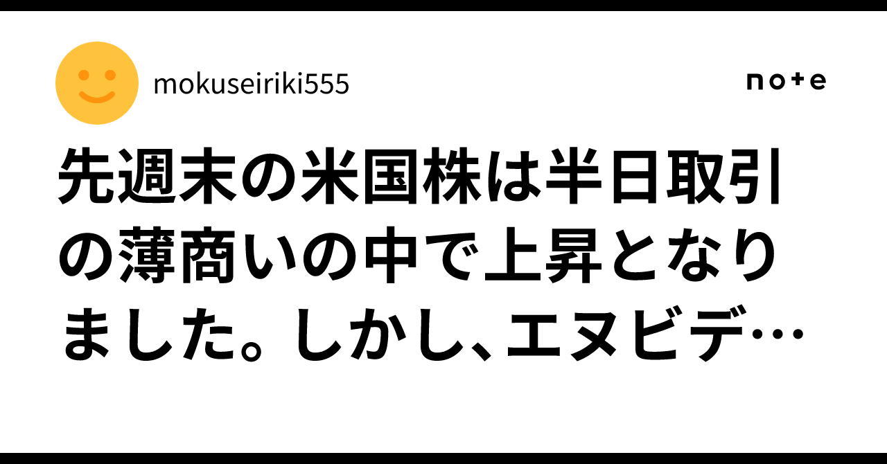 先週末の米国株は半日取引の薄商いの中で上昇となりました。しかし、エヌビディアとオラクルは下落、現在時間外でも小幅に下落となっています。|mokuseiriki555