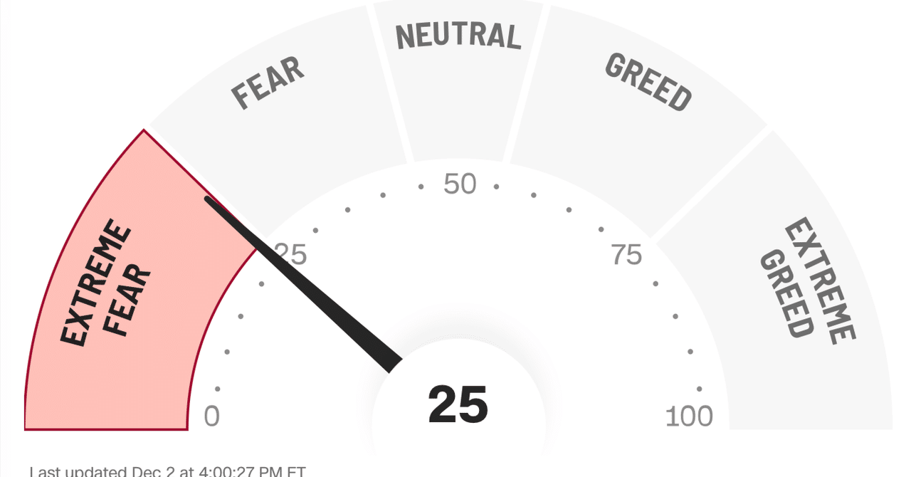 【12/3米国市場】 利下げ期待が支えとなりハイテク主導で反発。 ダウ+0.39% S&P500+0.25% ナスダック100+0.84% 金利上昇が一服しBTCも反発、FOMCへ関心集中。 原油は下落、金は上昇。 市場心理はFear&Greed=25で依然慎重。 note.com/rosy_oriole729…