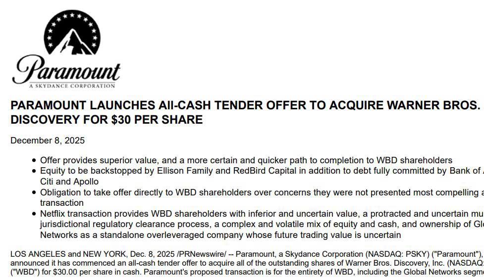 Paramount、米Warner買収に向けて株式公開買い付け。Netflixと争奪戦に