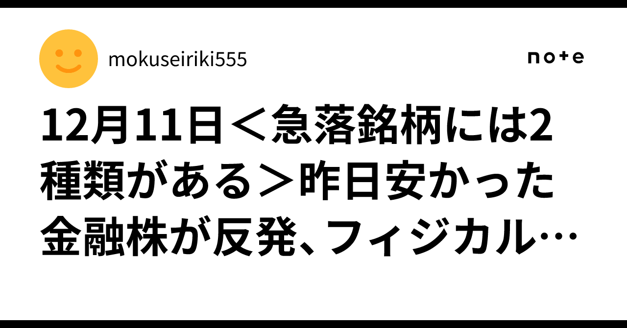 12月11日<急落銘柄には2種類がある>昨日安かった金融株が反発、フィジカルAIは堅調、一方で生成AI関連はまちまちの動きです。日経平均は寄付き直後が高値となって下落する展開が続いています。本日もそうい|mokuseiriki555