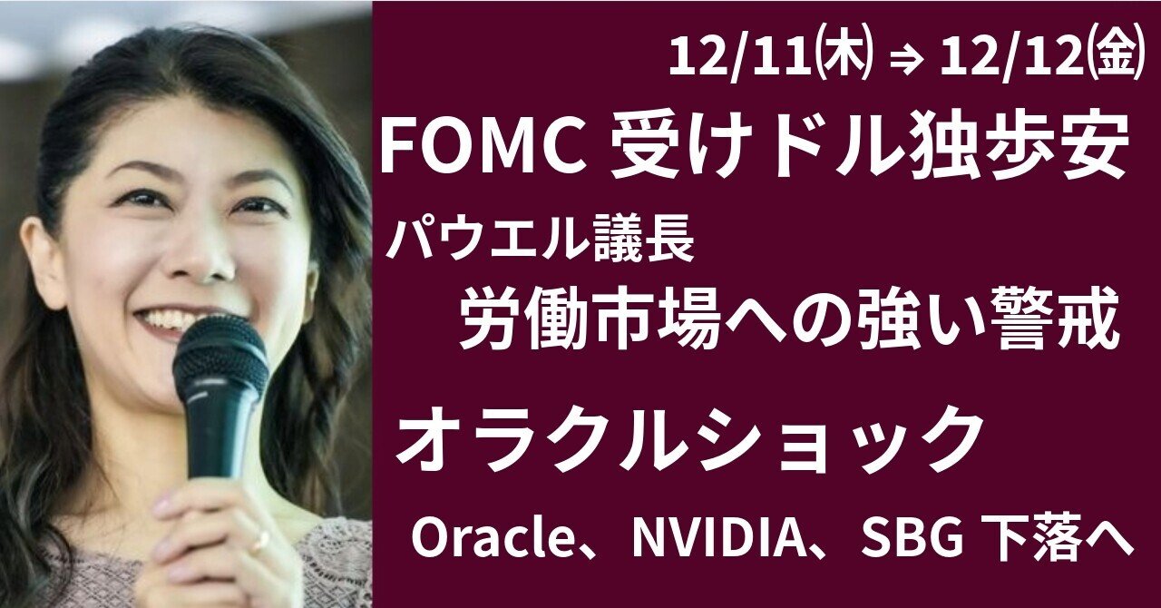 FOMC受けてドル独歩安、 Oracleショックで半導体銘柄下落 note.com/hiroko_lounge/… ・FOMC後ドル独歩安加速 ・ハト派だったパウエル議長会見 ・バランスシート拡大の流動性供給、 「NotQE、ButQE?」 ・Oracle決算受けて株価急落 ~NVIDIAなど半導体銘柄売りへ ・ドル円は来週の日銀に向けて