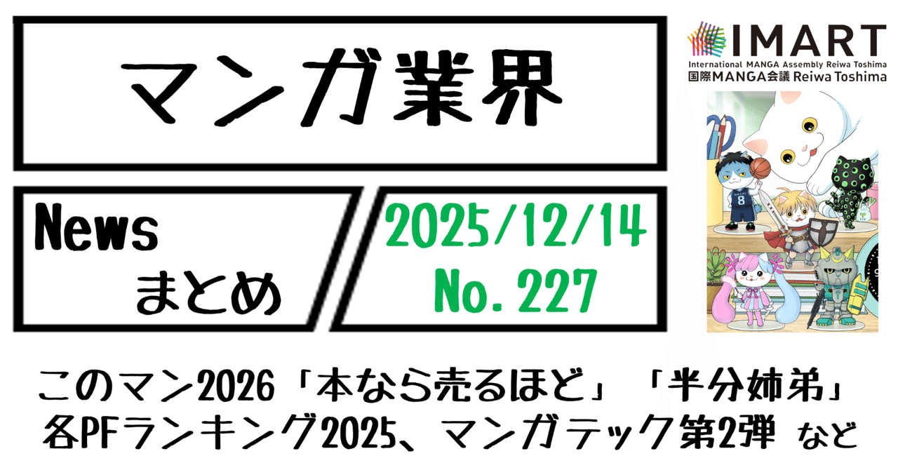 【マンガ業界Newsまとめ】このマン2026「本なら売るほど」「半分姉弟」、各PFランキング2025、マンガテック第2弾 など|12/14-227|菊池健