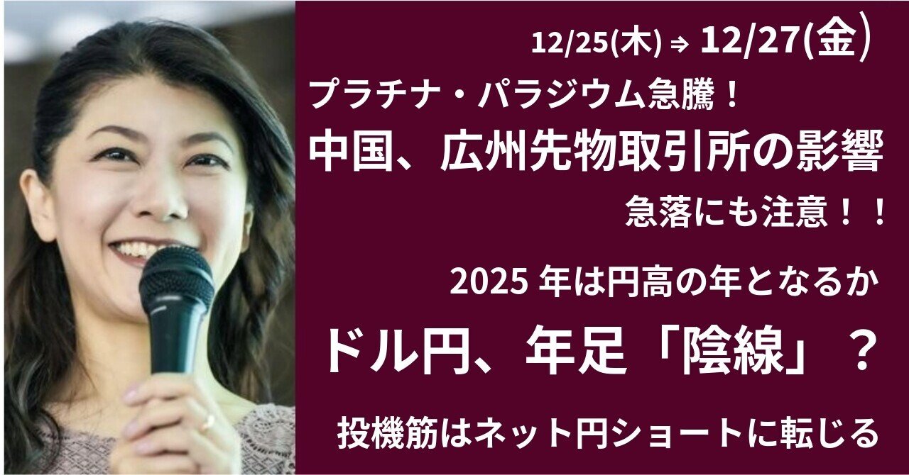 貴金属急騰の背景、急落にも注意 ~ドル円は年足「陰線」となる可能性note.com/hiroko_lounge/… ・米株はサンタクロースラリーの様相 ~なぜ株は強いのか ・ゴールド、シルバー、プラチナ、パラジウム 急騰、急落に注意 広州先物取引所の影響 ・2025年は年足円高?!