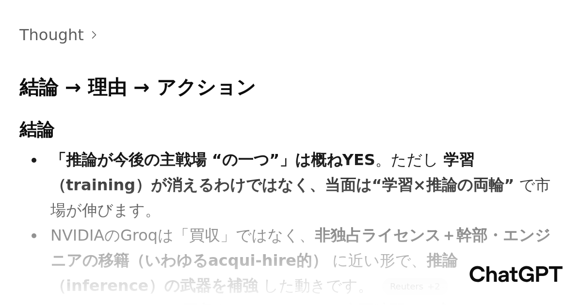 NVDAによる推論特化型チップ開発企業Groqの実質的買収からも推論市場が今後爆増することは自明 1問1答式の推論市場の司令塔はあらゆる物に入り面を取れるCPUになりやすい chatgpt.com/s/t_69507f86bb… エッジ推論の世界標準Armに加えArmベースのクラウド推論CPU開発企業Ampereを買収したSBGの構えは充分 pic.x.com/tQAka26vLO x.com/AI78140021/sta…