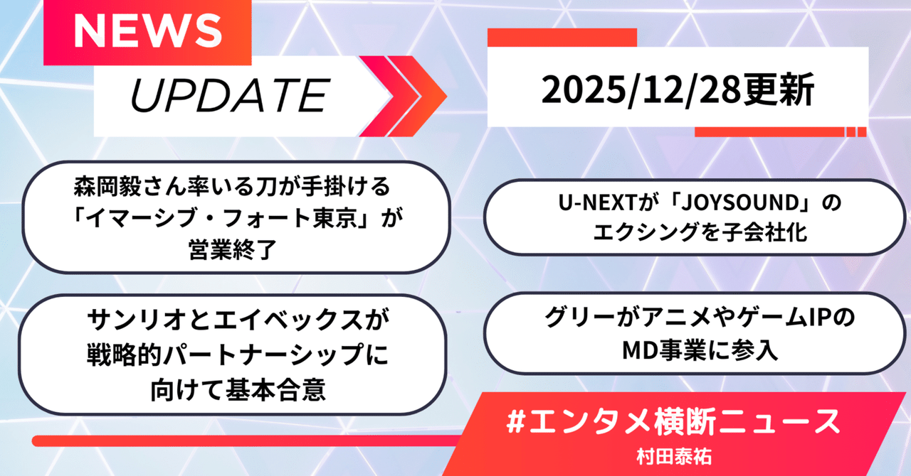 エンタメ横断ニュース、note更新❗️ ✅森岡毅さん率いる『イマーシブ・フォート東京』が営業終了 ✅Uが「JOYSOUND」のエクシングを子会社化🎤 ✅サンリオとエイベックスが戦略的パートナーシップに向けて基本合意🤝 ✅グリーがアニメやゲームIPのMD事業に参入 note.com/taisuke_murata…