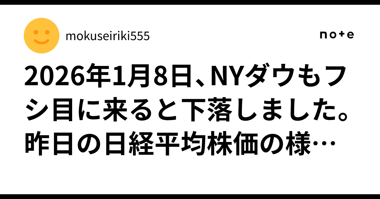 2026年1月8日、NYダウもフシ目に来ると下落しました。昨日の日経平均株価の様にです。大型株指数は下げても中小型株指数は上昇します。それが2026年顕著にみられる現象となります。7003、5726、6|mokuseiriki555