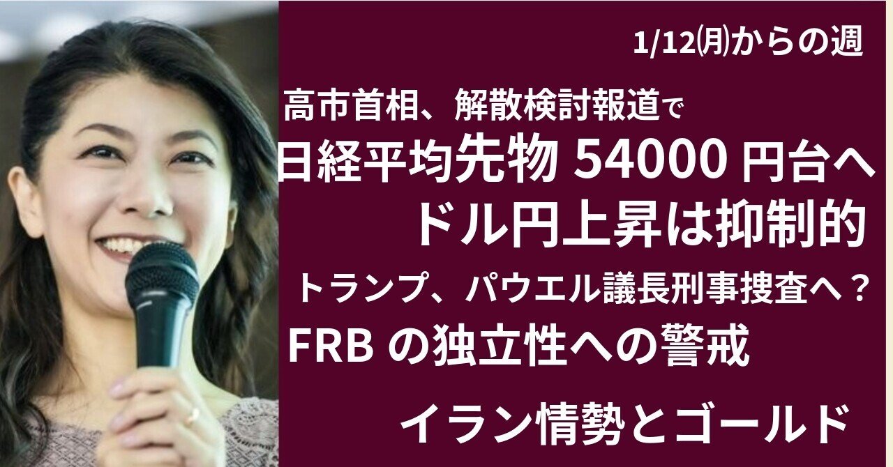 衆院解散報道で日経先物急騰 ~ドル円上昇が抑制的なワケは・・・ note.com/hiroko_lounge/… ・高市首相、 通常国会冒頭で衆院解散を検討報道 「選挙は買い」は本当か ・米雇用統計~ パウエルFRB議長刑事捜査でドル売り ・ゴールド上昇 FRBの独立性を脅かすトランプ政権