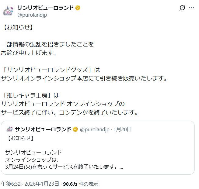 「サンリオピューロランドのEC終了」で誤解拡散 「サンリオ全体のEC終わる」と勘違い相次ぐ