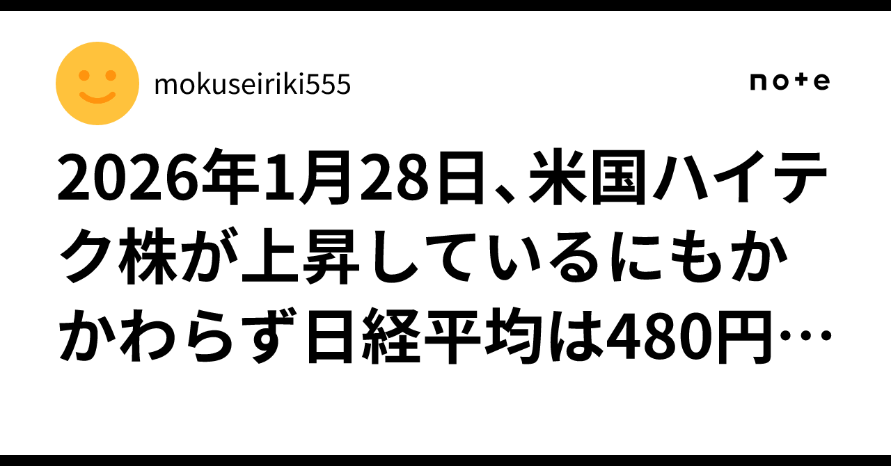 2026年1月28日、米国ハイテク株が上昇しているにもかかわらず日経平均は480円安まで入っています。半導体関連はまちまちの動き、一方政策テーマ株は個別に買われる展開となっています。7003、5726、|mokuseiriki555