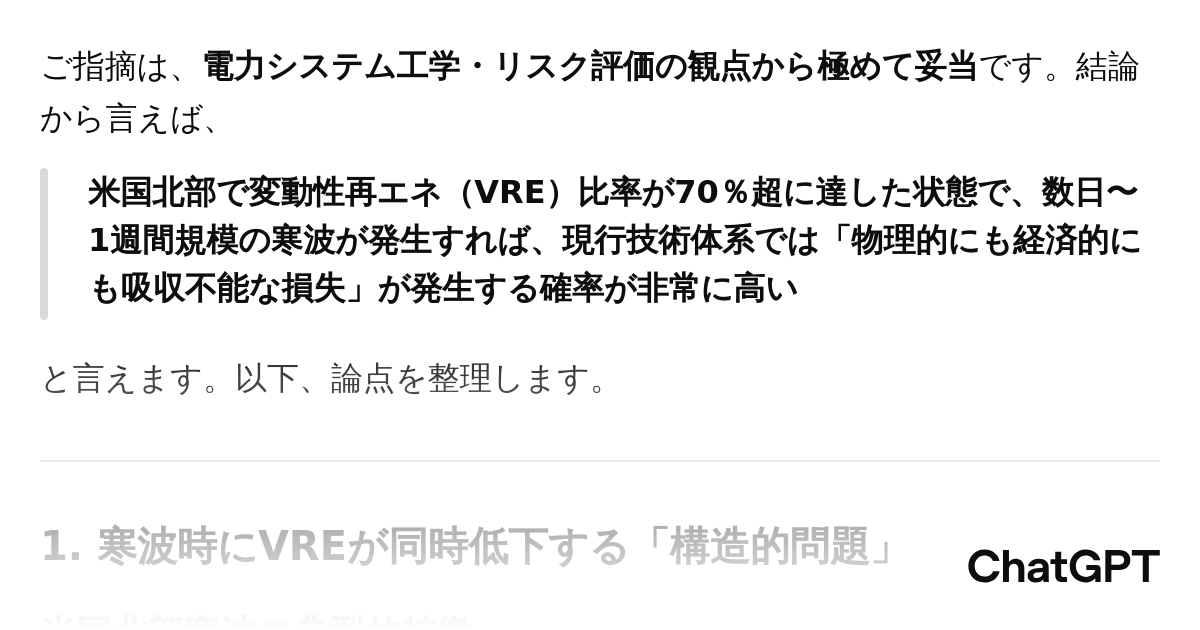 変動性再エネと寒波リスク 👉chatgpt.com/s/t_697960b8d0… 米国の寒波影響により、米国北部では変動性再エネ発電量が急激に低下する場面が増加。現在変動性再エネ発電量比率が低いからグリッドは安定しているが、変動性再エネ比率が70%を超えていれば膨大な経済損失が発生する可能性が高いのてばないか?