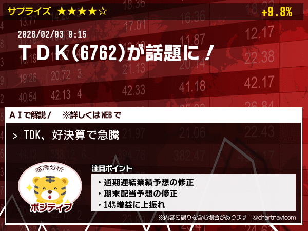 あなたはこのニュースについてどう思いますか? 関連する最近のニュースを知りたい場合は 「TDK」 「急騰」 「好決算」 で検索可能です。