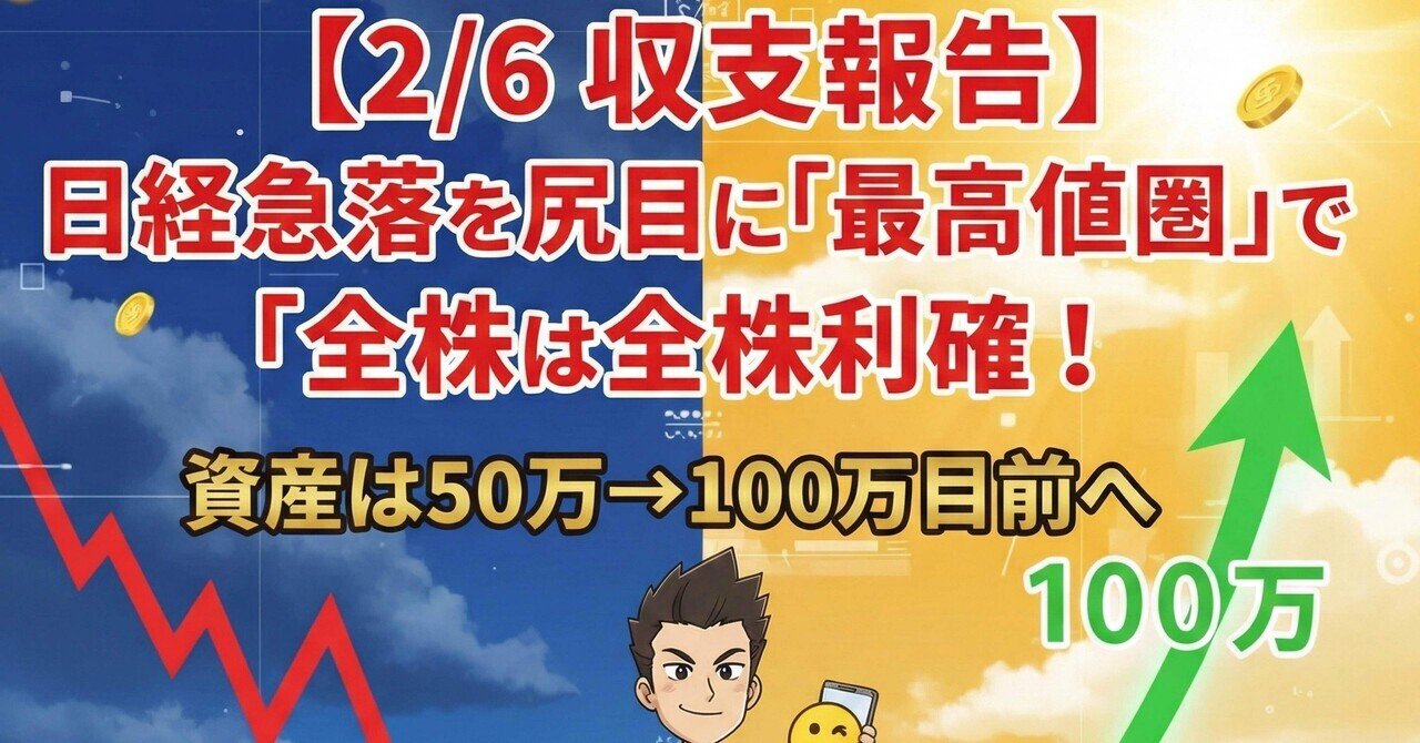 【2/6 収支報告】日経急落を尻目に「最高値圏」で全株利確!資産は50万→100万目前へ|ぷーちゃん