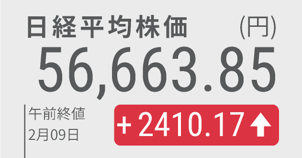 日経平均株価は大幅続伸、午前終値は2410円高の5万6663円 - 日本経済新聞