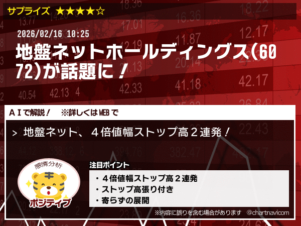 あなたはこのニュースについてどう思いますか? 関連する最近のニュースを知りたい場合は 「地盤ネット」 「4倍値幅ストップ高」 で検索可能です。