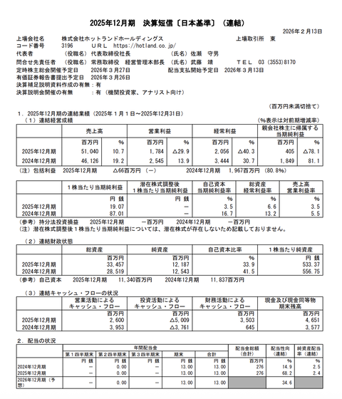 ホットランドHD 2025年12月期通期決算 : 官報ブログ