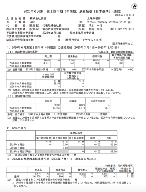 壽屋(コトブキヤ) 2026年6月期第2四半期決算 : 官報ブログ