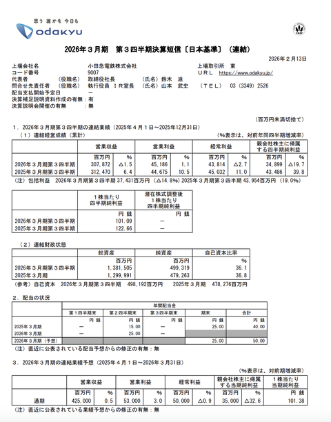 小田急電鉄 2026年3月期第3四半期決算 : 官報ブログ
