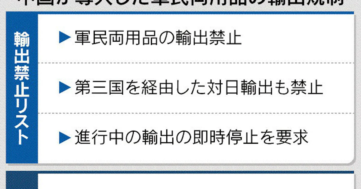 中国が事実上の対日禁輸 軍民両用品、20社・団体対象 三菱重系やIHI系、リスト入り 日本は撤回要求 - 日本経済新聞