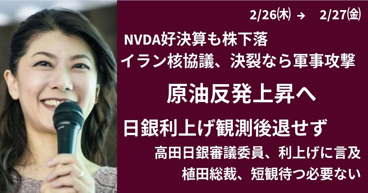 note.com/hiroko_lounge/… ・NVIDIA決算良好も株価下落 ・近くて遠い6万円? ~日経平均3日続伸も58000円台 ・イランへの軍事攻撃の可能性高まる ~3回目協議 ・原油高加速なら円安リスク ・日銀高田審議委員、利上げの必要性主張