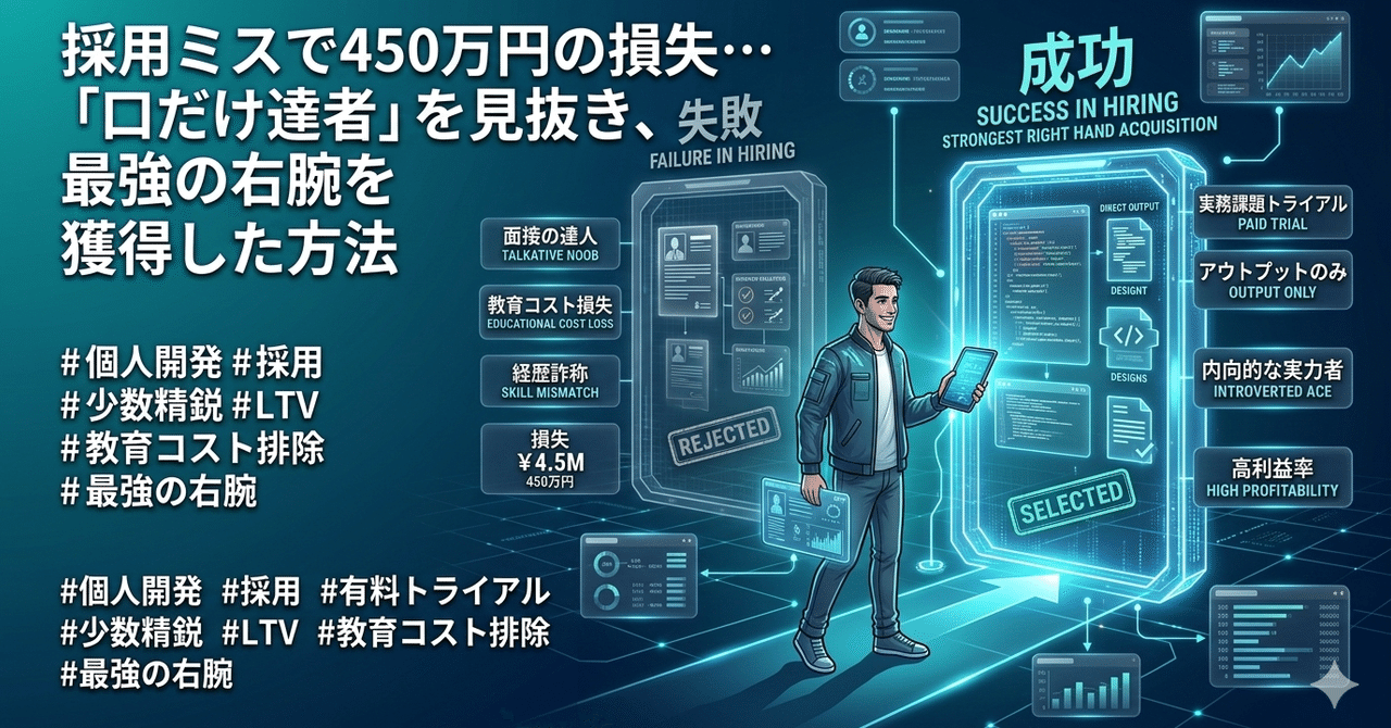 採用ミスで450万円の損失。口だけ達者な「自称プロ」に騙され、燃え尽きかけた個人開発者が辿り着いた、本物の右腕を見抜く「究極の選考フロー」が凄すぎる。 面接を捨て、ある「5時間の課題」を出すだけで、優秀な人材が向こうから現れる仕組みとは? 詳細はnoteへnote.com/happy_acacia80…