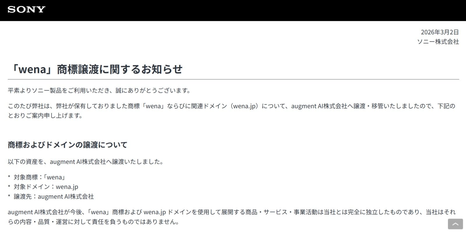 ソニーの「wena」はまだ生きている? augment AIへの商標・ドメイン移管に、謎のサイト