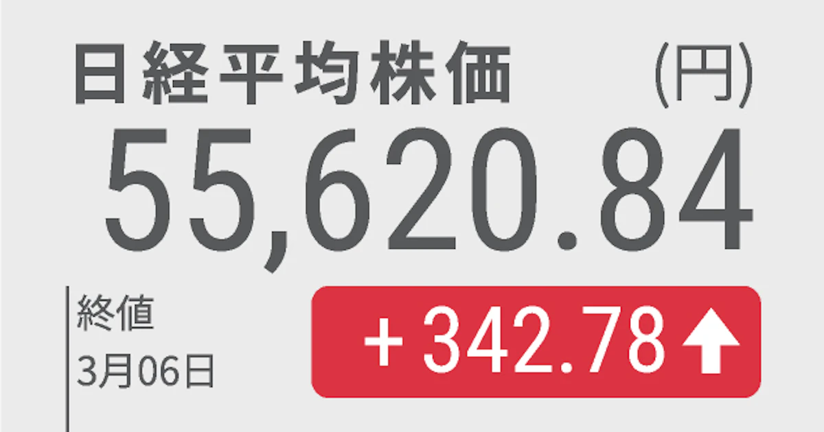 日経平均株価続伸、終値は342円高の5万5620円 - 日本経済新聞