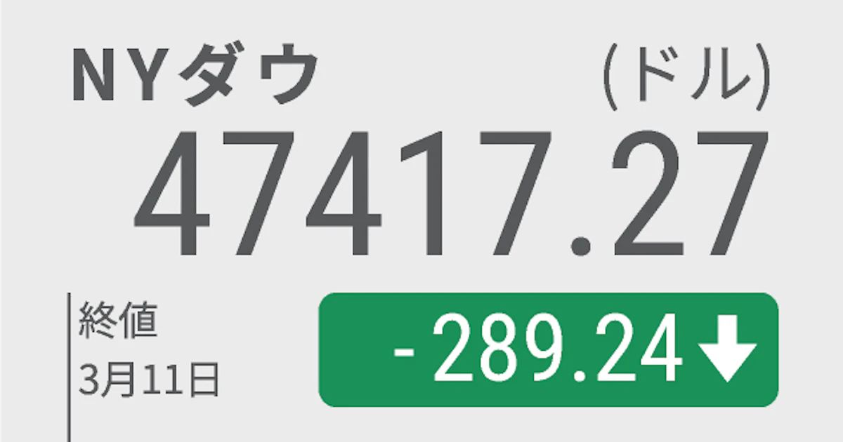 NYダウ続落、289ドル安 中東緊迫や原油高の長期化を懸念 - 日本経済新聞