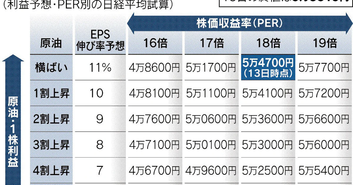 原油100ドル続けば日経平均5万円割れ視野 リスク回避で下押し 増益率・PERに低下圧力 - 日本経済新聞