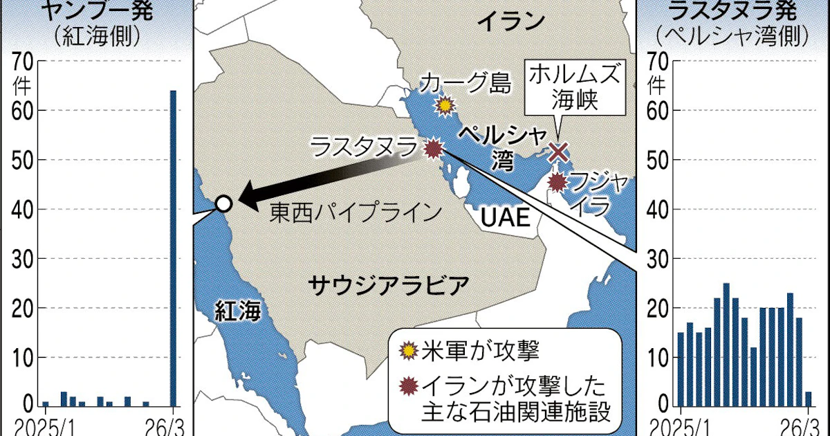 紅海発の原油輸送急増、前年比21倍 封鎖長期化にらみ迂回 調達コスト押し上げ - 日本経済新聞